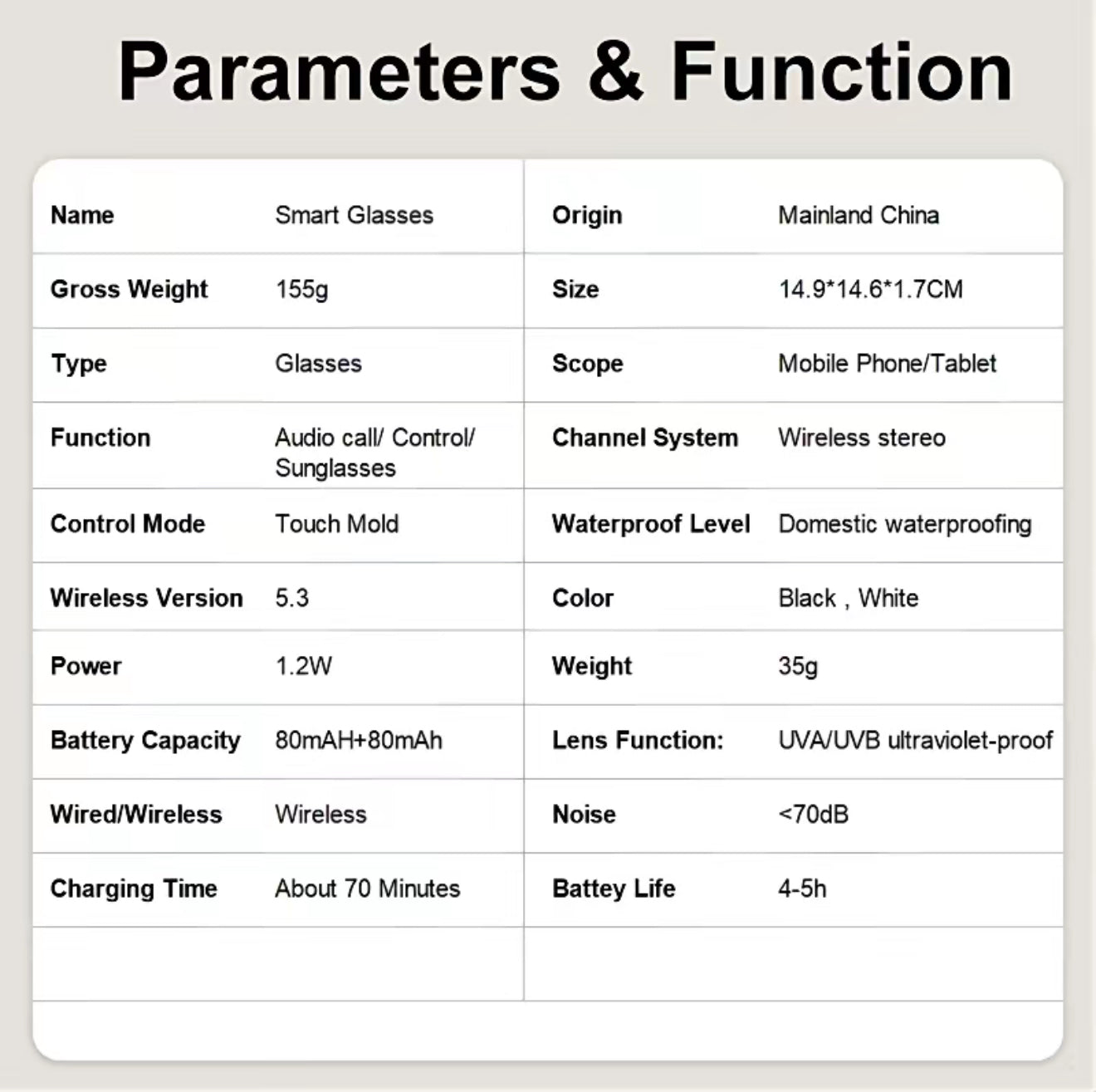 Powered by the AB5376A2 chip platform, these Bluetooth-enabled glasses offer a stable connection with a range of over 12 meters. Built-in HD stereo speakers (AACO) deliver clear audio for music, podcasts, and calls, while the high-sensitivity microphone with noise reduction ensures crisp, hands-free conversations.